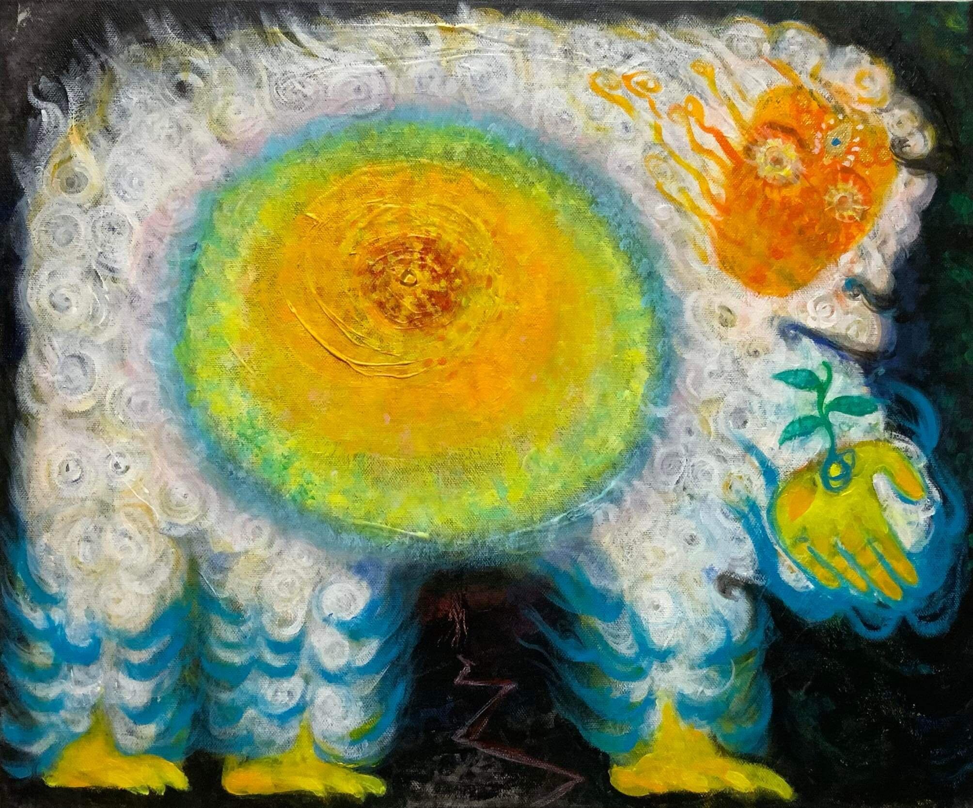 イノチと死が同時にあるところの産み出す源 死の中にイノチのゆりかごがある 全てが丸ごと天意である 6号キャンバス(410×318) アクリルカラー